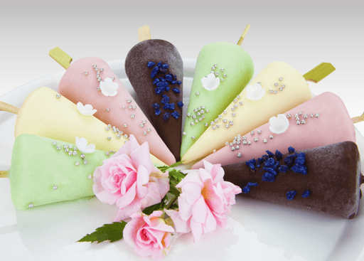 Cone shaped ice creams dipped in chocolate and decorated with sugar flowers and silver pearls.