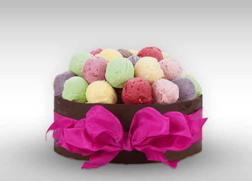 Round ice cream cake in the flavour of your choice, wrapped in chocolate, tied with a ribbon and decorated with ice cream and sorbet balls.