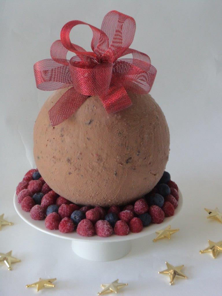 Our delicious plum pudding ice cream ball, decorated with Christmas bow, ready to serve. Serves 16 (cake stand and fruit not included).
